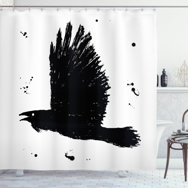 Black Crow Shower Curtain Grunge Hand Drawn Ink Sketch Of Flying Bird Gothic Art Paint Drops Fabric Bathroom Set With Hooks 69w X 84l Inches Extra Long Charcoal Grey And White By
